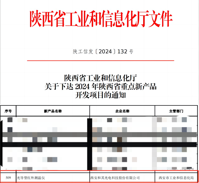 近日,陜西省工信廳公布了2024年陜西省重點新產(chǎn)品開發(fā)項目名錄,和其光電“光導(dǎo)型紅外測溫儀”入選新產(chǎn)品開發(fā)項目名單。